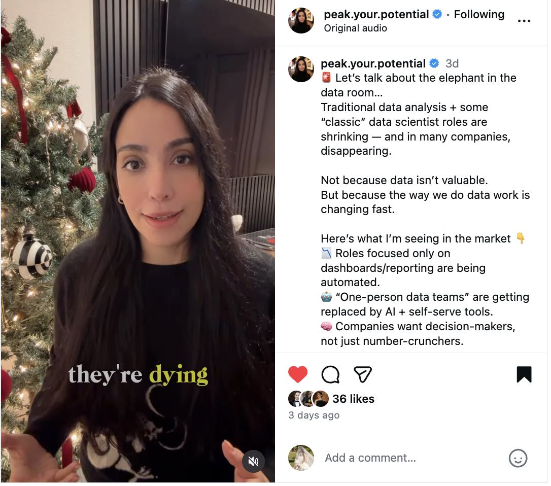 The data job market is more competitive than ever — but that doesn’t mean your career needs to slow down. In my recent Instagram Reels, I break down how data analysts, data scientists, and ML engineers can reposition themselves, expand into adjacent roles, and make themselves the “obvious hire” even when hiring is slow.